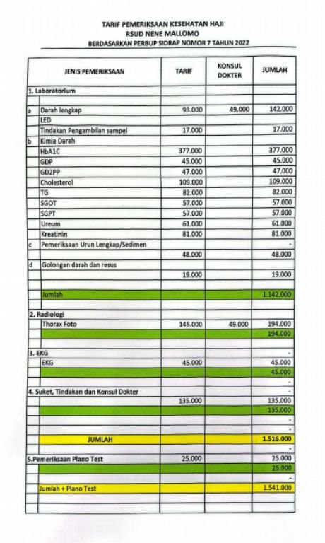 Dengan rincian tersebut, para calon Haji wajib membayar keseluruhan di uhaj Rumah Sakit Nene Mallomo sebesar Rp1.541.000,-.