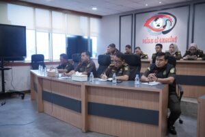 MAKASSAR,HBK — Kepala Kejaksaan Tinggi Sulawesi Selatan, Agus Salim didampingi Asisten Bidang Intelijen, Ardiansyah bersama kepala seksi dan jaksa fungsional pada Bidang Intelijen mengikuti pengarahan Jaksa Agung Muda Intelijen di Ruang Command Center Lantai 1 Kejati Sulsel, Senin (23/12/2024).