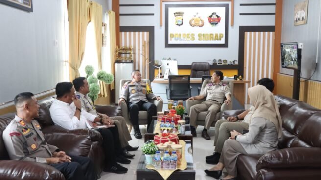 SIDRAP, HBK — Kapolres Sidrap, AKBP Dr. Fantry Taherong. SH.,S.I.K.,MH menerima kunjungan silaturahmi dari Kepala Badan Pertanahan Nasional (BPN) yang baru di Kabupaten Sidrap Bapak Taufik. S.T.,M.H.,M.Si bersama staf, pada Senin (7/10/2024).