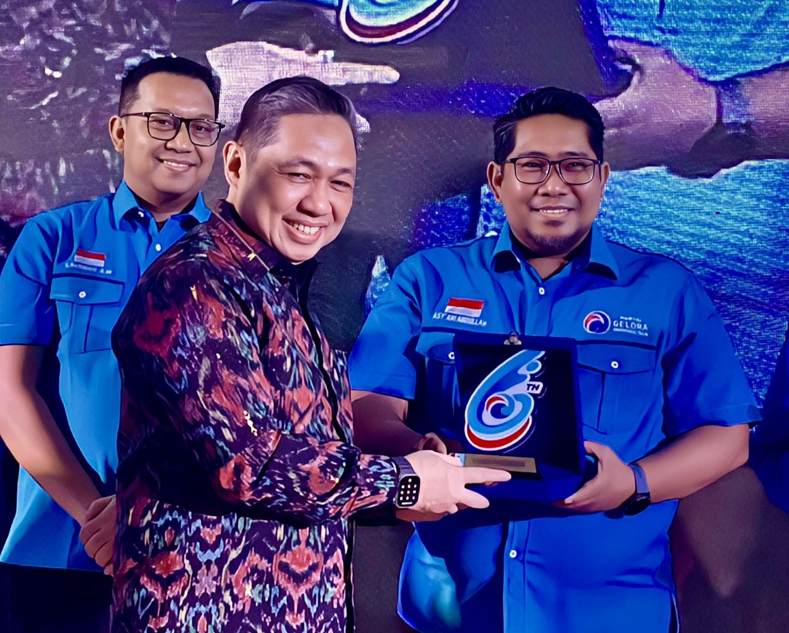 PAREPARE, HBK – Ketua DPD Partai Gelora Parepare, Asy’ari Abdullah, bersama Ketua Bappilu Partai Gelora Parepare, S. Parman Agus Mante, menerima penghargaan khusus pada puncak perayaan HUT ke-6 Partai Gelora Indonesia. Acara berlangsung meriah di Ballroom Hotel Horison Ultima, Minggu (16/11/2025).