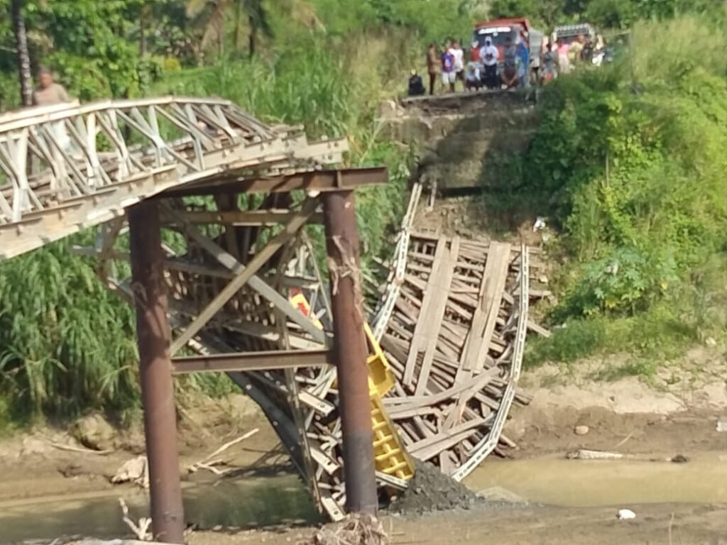 Jembatan penghubung antar desa ambruk sekitar pukul 08.00 WITA, mengakibatkan satu truk bermuatan pasir jatuh ke sungai.