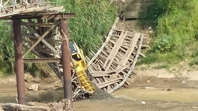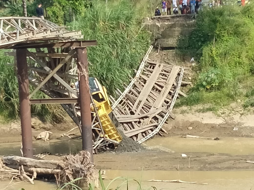 Jembatan penghubung antar desa ambruk sekitar pukul 08.00 WITA, mengakibatkan satu truk bermuatan pasir jatuh ke sungai.