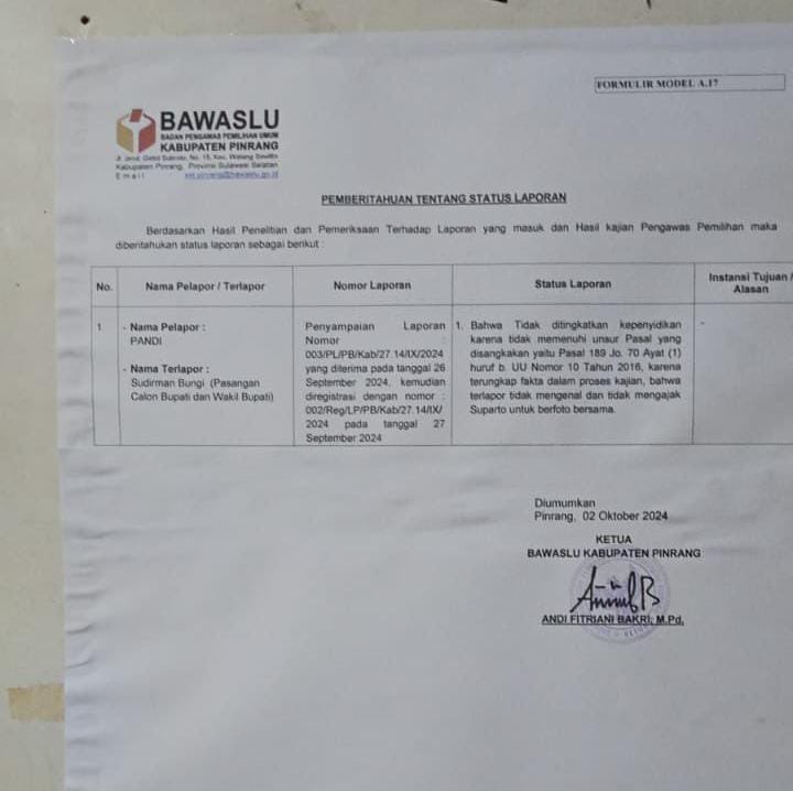 PINRANG, HBK — Badan Pengawas Pemilihan Umum (Bawaslu) Kabupaten Pinrang telah mengumumkan status laporan terkait calon Wakil Bupati Pinrang, Sudirman Bungi, yang disampaikan oleh pelapor bernama Pandi.
