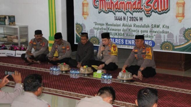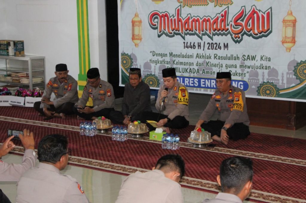 Pada momentum yang sakral ini , polres Enrekang memperingati Maulid Nabi Besar Muhammad 1446 H/2024 M dengan tema “Dengan Meneladani Akhlak Rasulullah SAW, Kita Tingkatkan Keimanan Dan Kinerja Guna Mewujudkan Pemilukada Aman Dan Sukses”.