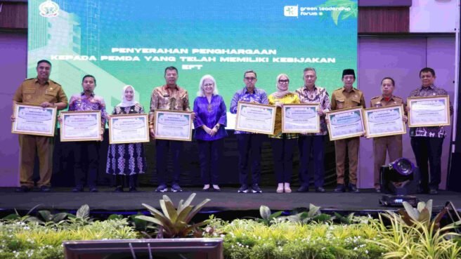 MAKASSAR,HBK , – Bupati Barru, Andi Ina Kartika Sari didampingi Wakil Bupati Barru Abustan Andi Bintang menerima penghargaan dari Koalisi Masyarakat Sipil untuk Pendanaan Ekologis (KMS-PE) yang diserahkan langsung oleh Country Representative TAF Indonesia Hana Satrio dan disaksikan langsung oleh Wamendagri Bima Arya yang telah memiliki Kebijakan Ecological Fiscal Transfer (EFT) dan IAD Perhutanan Sosial kategori Penerapan Insentif Fiskal berbasis Kinerja dalam kegiatan Green Leadership Forum (GLF) II Sulawesi Selatan yang digelar di Hotel Fourpoints Makassar, Selasa (29/07/2025).
