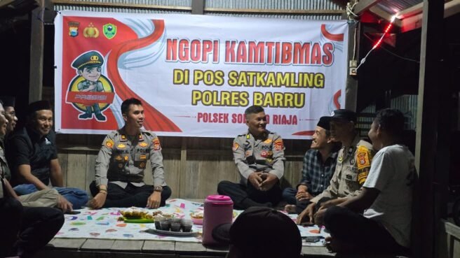 BARRU,HBK – Polsek Soppeng Riaja Polres Barru menggelar kegiatan Ngopi Kamtibmas di Pos Satkamling Polres Barru yang berlokasi di Dusun Siddo, Desa Siddo, Kecamatan Soppeng Riaja, Kabupaten Barru, Kamis malam (18/12/2025). Kegiatan ini menjadi wadah komunikasi langsung antara kepolisian dan masyarakat dalam menjaga keamanan dan ketertiban lingkungan.