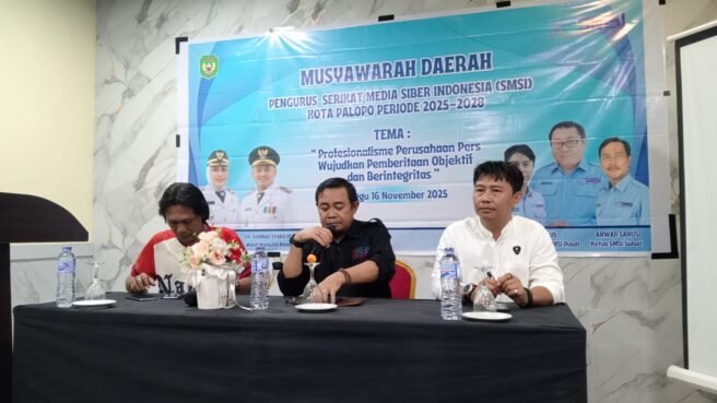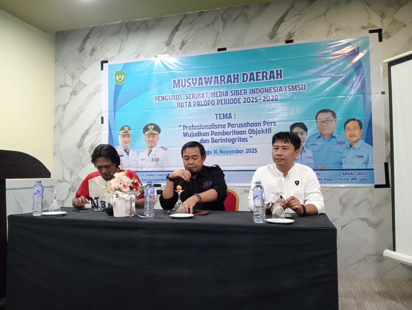 PALOPO, HBK — Musyawarah Daerah (Musda) Serikat Media Siber Indonesia (SMSI) Kota Palopo berjalan lancar dan sukses. Agenda yang digelar di Hotel Harapan, Jalan Mangga, Kelurahan Lagaligo, Wara, Kota Palopo, pada Minggu (16/11/2025), itu mengukuhkan Dedy Ariyanto sebagai Ketua SMSI Palopo periode 2025–2028 melalui keputusan aklamasi.