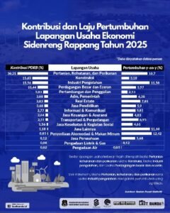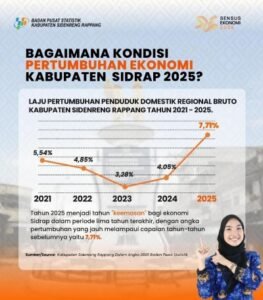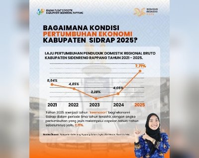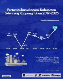 Data resmi Badan Pusat Statistik mencatat laju pertumbuhan ekonomi daerah ini mencapai 7,71 persen pada 2025, tertinggi dalam delapan tahun terakhir dan menempatkan Sidrap sebagai daerah dengan pertumbuhan tercepat di Sulawesi Selatan.