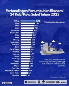 Berdasarkan perbandingan pertumbuhan ekonomi kabupaten/kota di seluruh Sulawesi tahun 2025, posisi Sidrap berada di jajaran elite lima besar: