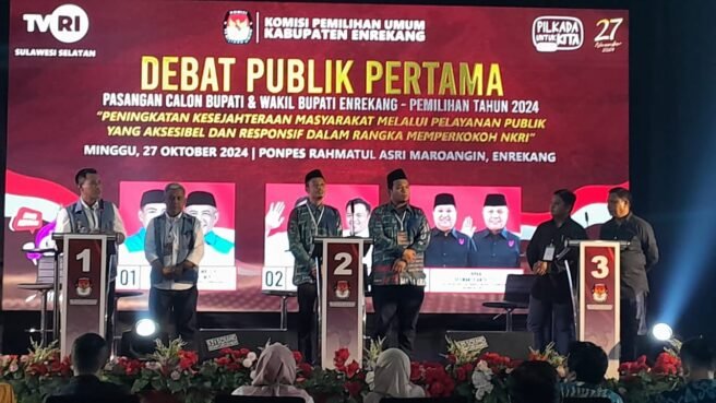 ENREKANG, HBK — Debat perdana calon bupati dan wakil Bupati 2024-2029 telah selesai digelar Komisi Pemilihan Umum (KPU) Kabupaten Enrekang, Minggu (17/10).