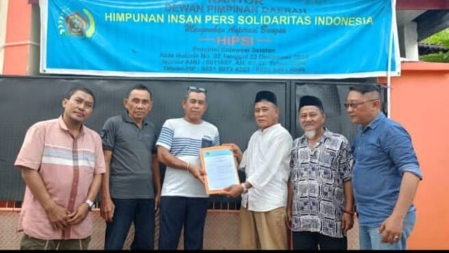 MAROS, HBK — Ketua Dewan Pimpinan Daerah (DPD) Himpunan Insan Pers Solidaritas Indonesia (HIPSI) Provinsi Sulawesi Selatan, H. Irianto Amama, S.H., secara resmi menyerahkan Surat Keputusan (SK) Kepengurusan Dewan Pimpinan Cabang (DPC) HIPSI Kabupaten Enrekang kepada Ketua DPC terpilih, Andi Nasruddin, Sabtu (9/8/2025).