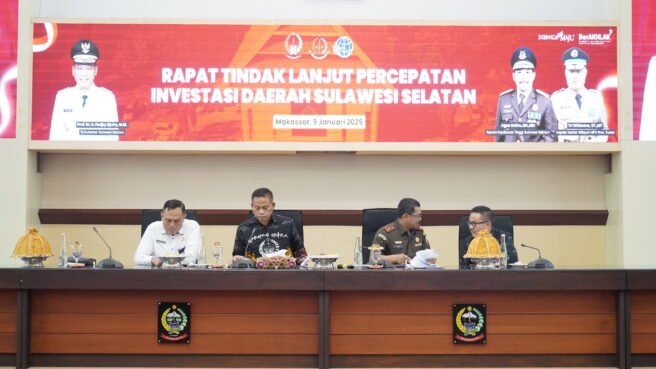 Rapat ini dipimpin langsung Penjabat Gubernur Sulsel, Prof Fadjry Djufry selaku Ketua Satgas. Dan dihadiri Kepala Kanwil ATR/BPN Provinsi Sulsel, Tri Wibisono (Wakil Sekretaris Satgas), Sekretaris Daerah Sulsel Jufri Rahman (Sekretaris Satgas) dan seluruh anggota Satgas Percepatan Investasi Sulsel.