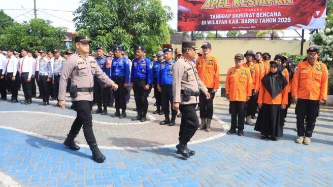 BARRU,HBK – Polres Barru menggelar apel kesiapsiagaan bencana hidrometeorologi tahun 2025 yang dilaksanakan secara serentak di halaman Mapolres Barru, Rabu (5/11/2025). Apel siaga ini untuk memastikan kesiapan personel dan sarana prasarana dalam menghadapi potensi bencana alam di wilayah Kabupaten Barru.