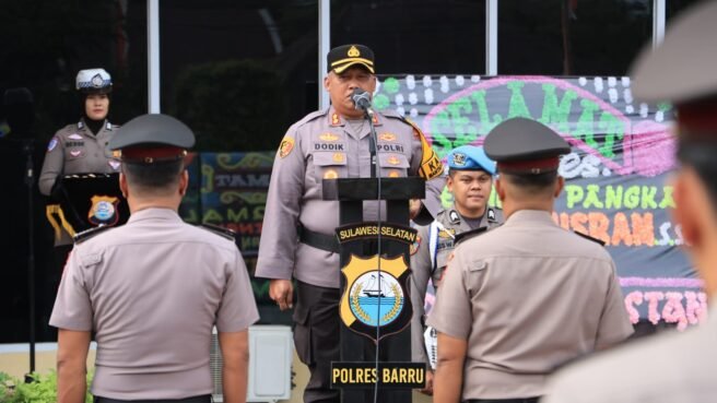 BARRU,HBK – Kepala Kepolisian Resor (Kapolres) Barru AKBP Dodik Susianto, S.I.K memimpin upacara kenaikan pangkat 27 personelnya di halaman Polres, Jl. Jendral Sudirman pada Kamis (02/01/2025). Upacara yang diikuti oleh Wakapolres dan sejumlah Pejabat Utama tersebut juga diikuti oleh Ketua Bhayangkari Cabang Barru Ny. Ejhi Dodik Susianto bersama pengurus.