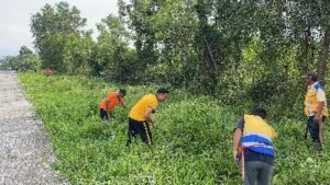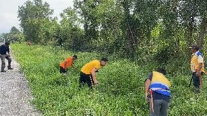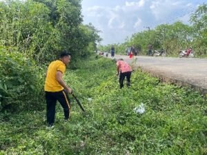 Kasat Intelkam Polres Sidrap, IPTU Aswan, terlihat membaur tanpa sekat bersama masyarakat membersihkan rumput liar dan semak belukar di sepanjang Jalan Poros Tanru Tedong–Barukku.