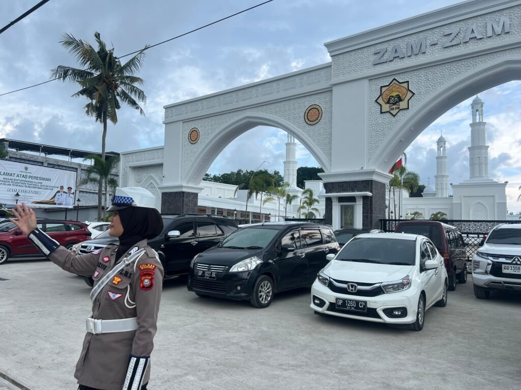 BARRU,HBK – Personel Polisi Wanita (Polwan) Satuan Lalu Lintas (Satlantas) Polres Barru melaksanakan kegiatan pengamanan pelaksanaan ibadah Salat Jumat di Masjid Zam-Zam Center Kabupaten Barru, Jumat (7/11/2025).