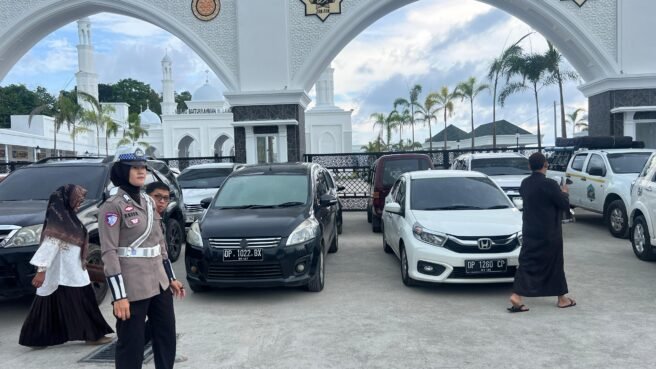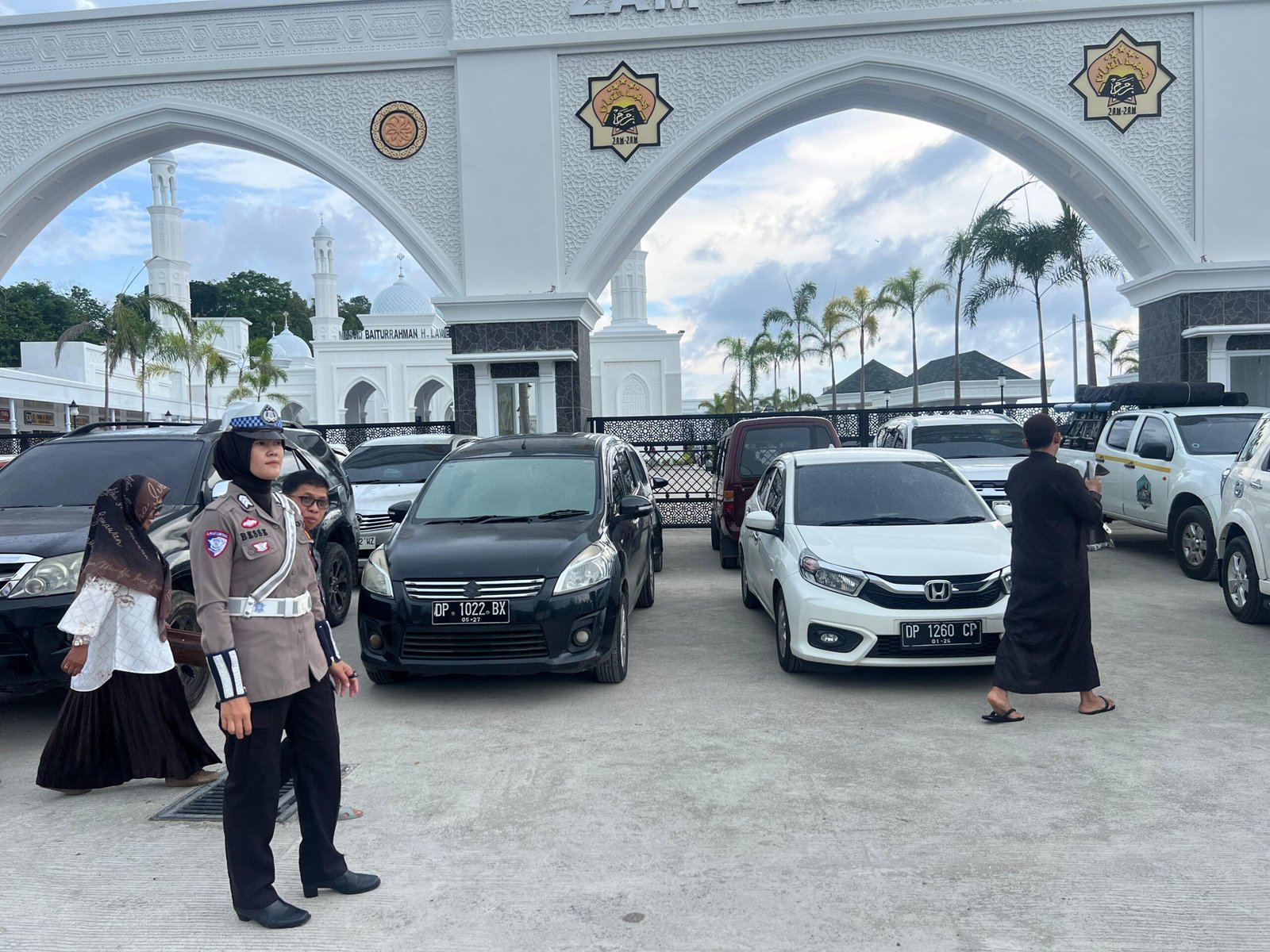 BARRU,HBK – Personel Polisi Wanita (Polwan) Satuan Lalu Lintas (Satlantas) Polres Barru melaksanakan kegiatan pengamanan pelaksanaan ibadah Salat Jumat di Masjid Zam-Zam Center Kabupaten Barru, Jumat (7/11/2025).