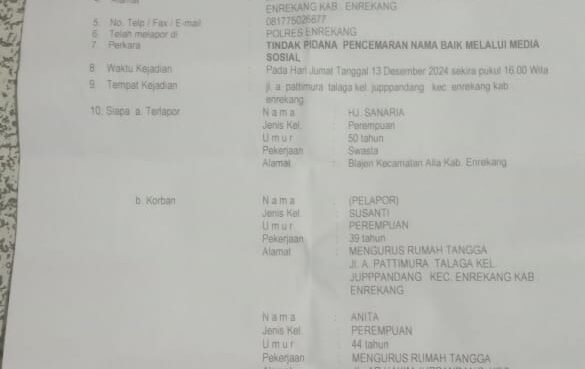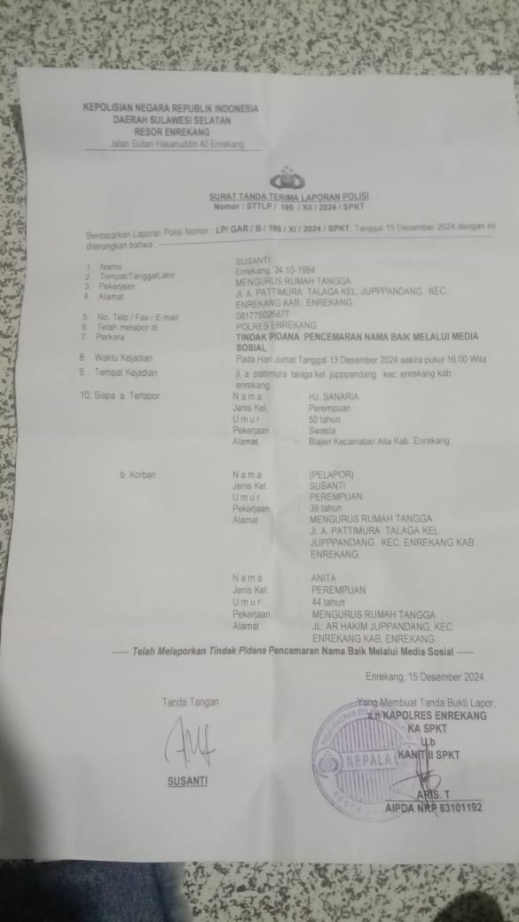 ENREKANG, HBK – Kasus dugaan penghinaan dan pencemaran nama baik terhadap Santi dan Anita melalui akun media sosial Facebook kini telah memasuki tahap penyelidikan. Laporan tersebut resmi diterima oleh Polres Enrekang sejak 15 Desember 2024, dengan Nomor Surat Tanda Terima Laporan Polisi: STTLP/195/XII/2024/SPKT.