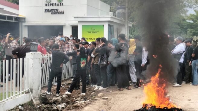 ENREKANG HBK — Ratusan mahasiswa yang tergabung dalam Aliansi Masyarakat Enrekang kembali menggelar aksi unjuk rasa di depan Kantor Kejaksaan Negeri (Kejari) Enrekang, Sulawesi Selatan, Senin (14/12/2025).