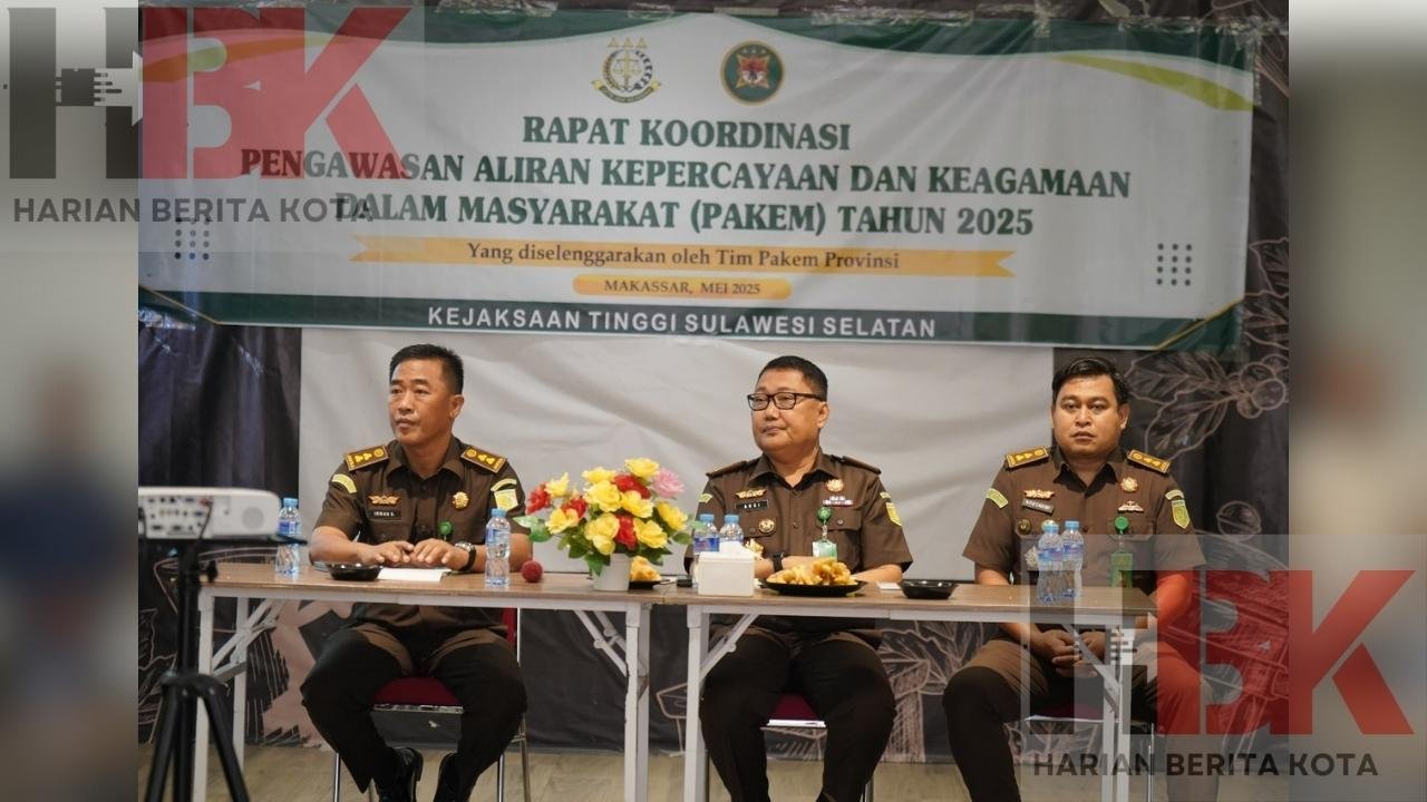 MAKASSAR, HBK — Kejaksaan Tinggi (Kejati) Sulawesi Selatan menggelar Rapat Koordinasi Pengawasan Aliran Kepercayaan dan Aliran Keagamaan Dalam Masyarakat (PAKEM) tingkat Provinsi Sulawesi Selatan pada Selasa, 27 Mei 2025, di Makassar.