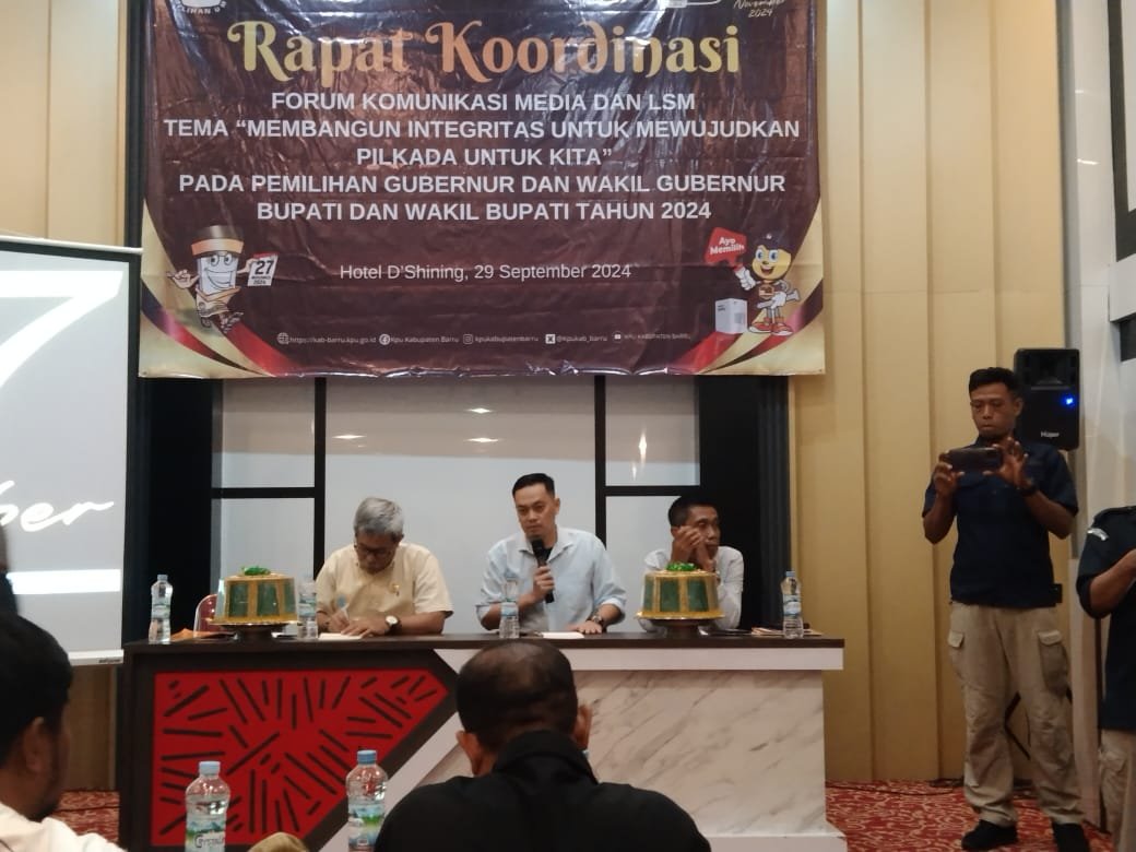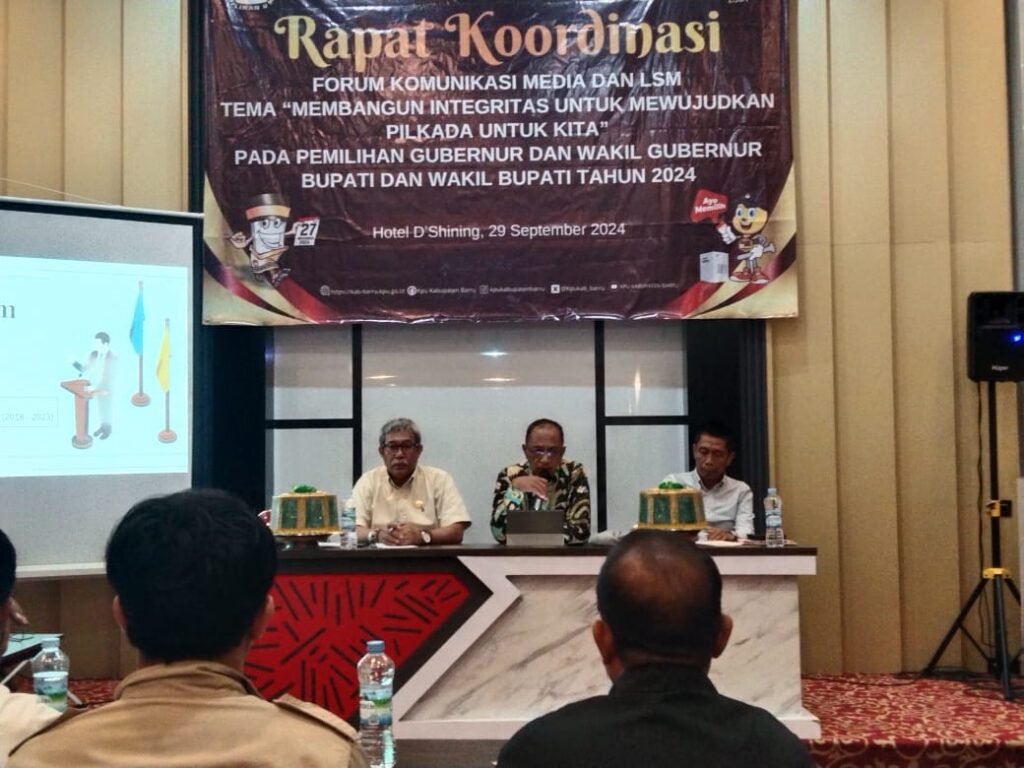 BARRU, HBK – Bagian dan Upaya Pilkada Damai Kabupaten Barru, dalam hal ini Komisi Pemilihan Umum (KPU) Kabupaten Barru dalam mewujudkan hal tersebut dengan menggelar Rapat Koordinasi Forum Komunikasi Media dan LSM dengan mengangkat tema “Membangun integritas untuk mewujudkan pilkada untuk kita” pada pemilihan gubernur dan wakil gubernur, bupati dan wakil bupati tahun 2024. Kegiatan ini digelar di Hotel D’Shining, Ahad (29/09/2024).