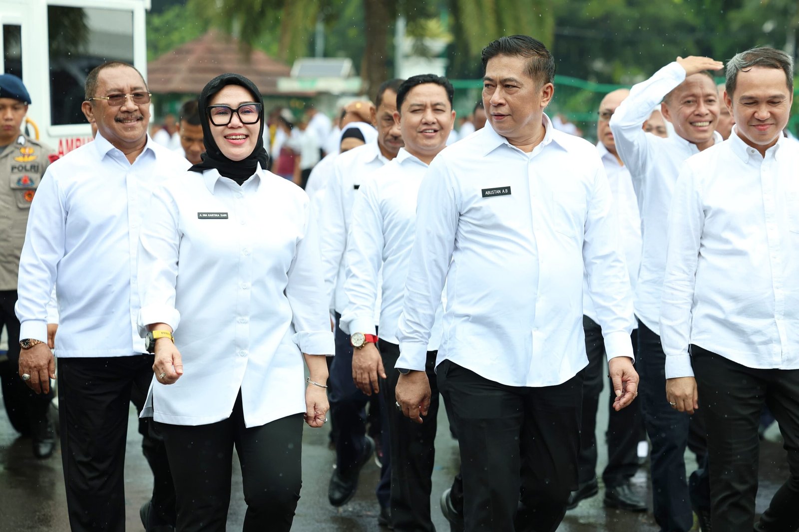 Dibawah rintik hujan A. Ina- Abustan masuk yang dalam pelaton 15 dari 30 pelaton, dengan disiplin terjaga tetap semangat mengikuti gladi bersih. Dengan menggunakan setelan baju kemeja putih celana hitam dan sepatu fantopel. Mereka dilatih baris berbaris, jalan ditempat dan sikap sempurna.