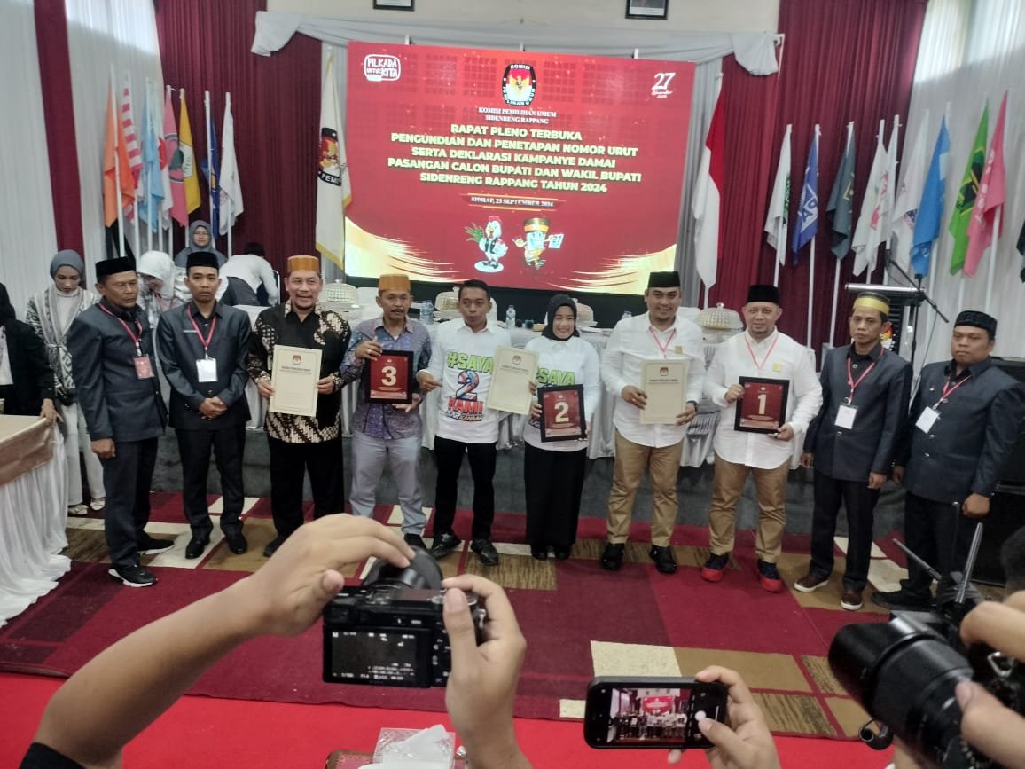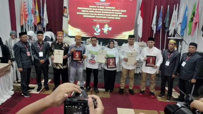 SIDRAP, HBK — Komisi Pemilihan Umum (KPU) Kabupaten Sidrap resmi menggelar pengundian nomor urut pasangan calon Bupati dan Wakil Bupati untuk Pilkada 2024, Senin, 23 September 2024