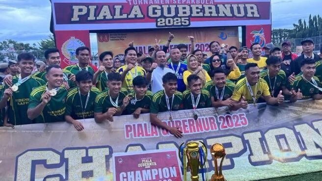 SIDRAP, HBK — Laskar Ganggawa Sidrap kembali mencatat sejarah di kancah sepak bola Sulawesi Selatan. Pada final Piala Gubernur Sulawesi Selatan 2025 di Stadion Kalegowa, Gowa, Sidrap menaklukkan Wajo dengan skor 2-0.