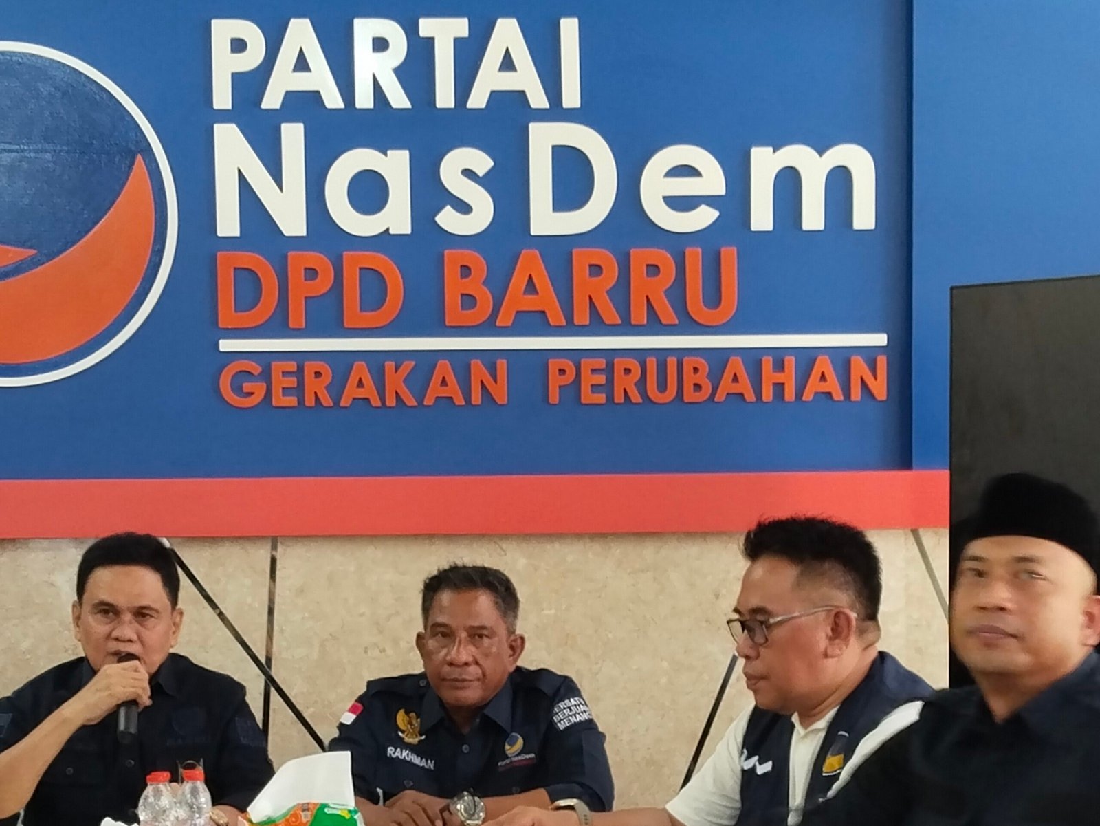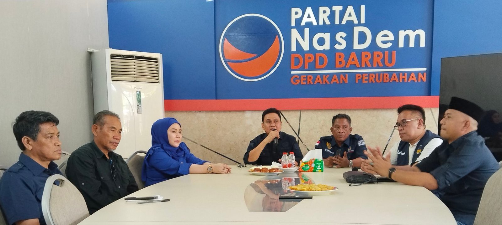Ketua DPD Nasdem Barru Ir Suardi Saleh Msi memimpin kegiatan press rilis dirumah aspirasi jln Sultan Hasanuddin, Kecamatan Barru, Kabupaten Barru, Sulsel, pada Rabu (15/04/2026) siang.