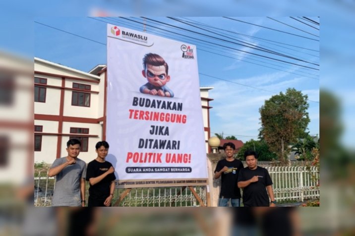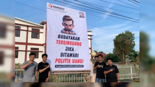 Salah satu pesan yang menonjol dalam baliho tersebut adalah “Budayakan Tersinggung Jika Ditawari Politik Uang.”