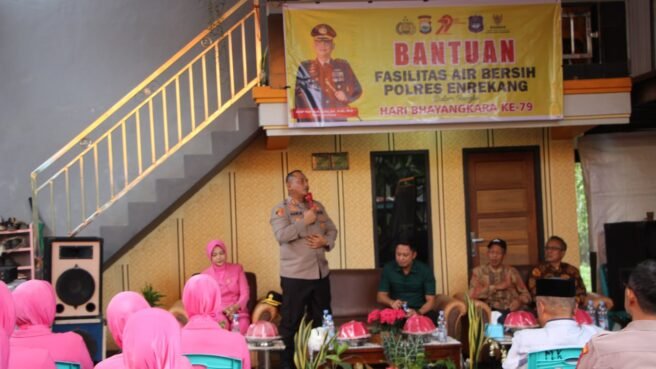 ENREKANG, HBK — Dalam rangka memperingati Hari Bhayangkara ke-79 tahun 2025, Polres Enrekang menunjukkan kepeduliannya terhadap kebutuhan dasar masyarakat dengan menyerahkan bantuan fasilitas air bersih kepada warga Desa Taulo, Kecamatan Alla Kabupaten Enrekang, pada Jumat (27/6/2025).