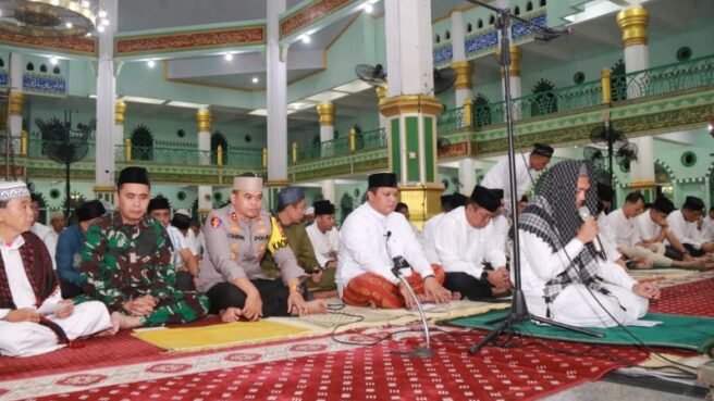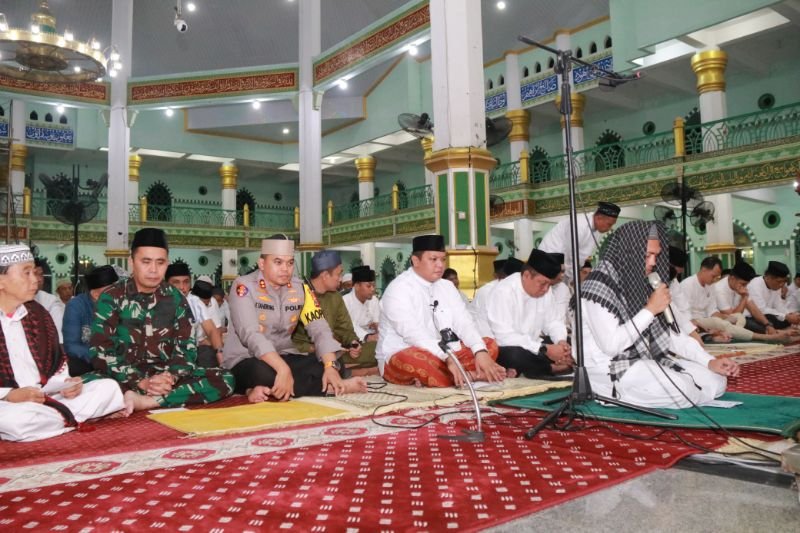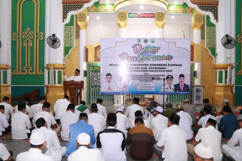 SIDRAP, HBK – Kapolres Sidrap AKBP Fantry Taherong bersama Forum Komunikasi Pimpinan Daerah (Forkopimda) Kabupaten Sidrap, Wakapolres dan PJU Polres Sidrap menggelar acara Dzikir dan Doa Bersama di Masjid Agung Pangkajene, Selasa malam (31/12/2024).