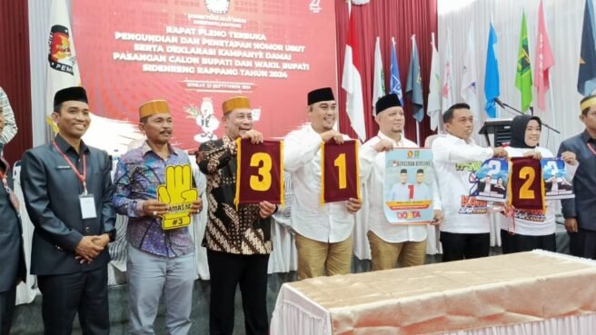 SIDRAP, HBK – Pasangan calon (paslon) Bupati dan Wakil Bupati Sidrap, H. Mashur dan H. Nasiyanto, mencuri perhatian publik saat menghadiri acara pencabutan nomor urut di kantor Komisi Pemilihan Umum (KPU) Sidrap pada Senin, 23 September 2024.