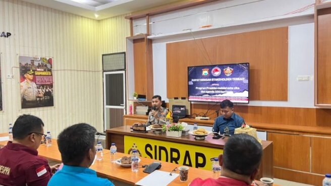 SIDRAP, HBK — Dalam rangka mendukung Asta Cita Presiden RI H. Prabowo Subianto yang berfokus pada pencegahan dan pemberantasan narkoba, Wakapolres Sidrap KOMPOL Ahmad Rosma didampingi oleh Kasat Resnarkoba IPTU M. Patria Pratama memimpin rapat koordinasi lintas sektoral di Ruang Vicon Mapolres Sidrap.