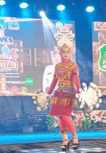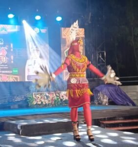 Dengan tema “Fashion Show Adat Nusantara”, Ratu tampil memukau mengenakan kostum adat Kalimantan Timur bernuansa merah menyala. Busana itu dihiasi bulu di kepala dan tangan, gelang kaki, serta manik-manik khas suku Dayak—simbol kekuatan dan keanggunan yang merepresentasikan filosofi budaya Indonesia.