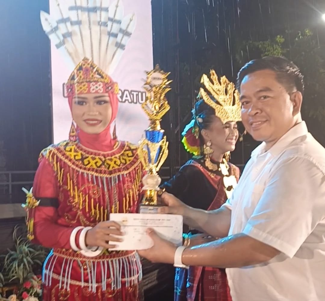 Dengan tema “Fashion Show Adat Nusantara”, Ratu tampil memukau mengenakan kostum adat Kalimantan Timur bernuansa merah menyala. Busana itu dihiasi bulu di kepala dan tangan, gelang kaki, serta manik-manik khas suku Dayak—simbol kekuatan dan keanggunan yang merepresentasikan filosofi budaya Indonesia.