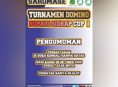 SIDRAP, HBK — Antusiasme masyarakat terhadap Turnamen Domino Bupati Sidrap Cup I terus meningkat. Menyikapi tingginya minat peserta, panitia resmi mengumumkan perpanjangan masa pendaftaran hingga Kamis malam, 9 Oktober 2025, pukul 23.59 WITA.