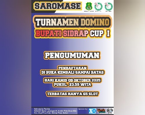 Turnamen Domino Bupati Sidrap Cup I dijadwalkan berlangsung dalam waktu dekat, dan dipastikan akan menjadi salah satu ajang paling meriah di Kabupaten Sidrap tahun ini. (*)