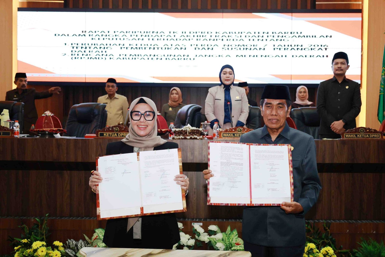 Pengesahan Ranperda tersebut ditandai dengan Penadatanganan Naskah Keputusan bersama antara Bupati Barru Andi Ina Kartika Sari, SH.,M.Si., bersama Ketua DPRD Barru, Drs. H. Syamsuddin Muhiddin, M.Si.