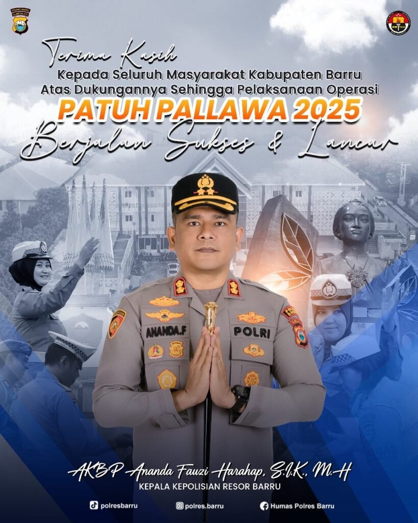 BARRU,HBK – Kapolres Barru AKBP Ananda Fauzi Harahap, S.I.K., M.H mengucapkan terima kasih kepada seluruh masyarakat Barru atas kontribusinya sehingga pelaksanaan Operasi Patuh Pallawa 2025 berjalan lancar.Senin (28/07/2025).
