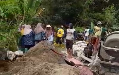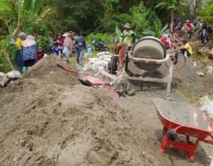 ENREKANG, HBK – Warga Kelurahan Tuara bersama masyarakat Desa Bamba Puang bergotong royong melakukan pengecoran darurat di Jalan Kalinbubu, Sabtu (27/9/2025).