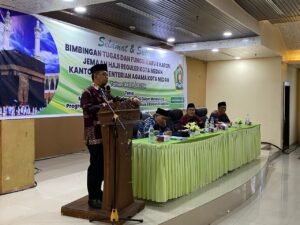 MEDAN, HBK — Dalam rangka meningkatkan kualitas pelayanan haji, Tenaga Ahli Menteri Agama RI Dr. H. Bunyamin M. Yapid, Lc., M.H., menghadiri kegiatan bimbingan teknis tugas dan fungsi Ketua Regu dan Ketua Rombongan Jemaah Haji Kota Medan Tahun 1446 H/2025, Rabu (23/04/2025).