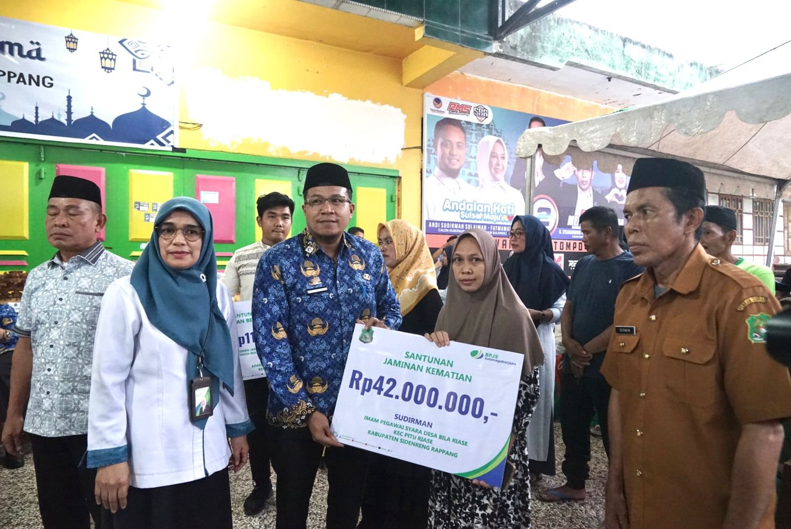SIDRAP, HBK – Tiga ahli waris peserta Badan Penyelenggara Jaminan Sosial Ketenagakerjaan (BPJamsostek) menerima santunan Jaminan Kematian (JKM) dalam kegiatan Safari Ramadan yang digelar Pemerintah Kabupaten (Pemkab) Sidrap di Kecamatan Pitu Riase, Senin (17/3/2025).