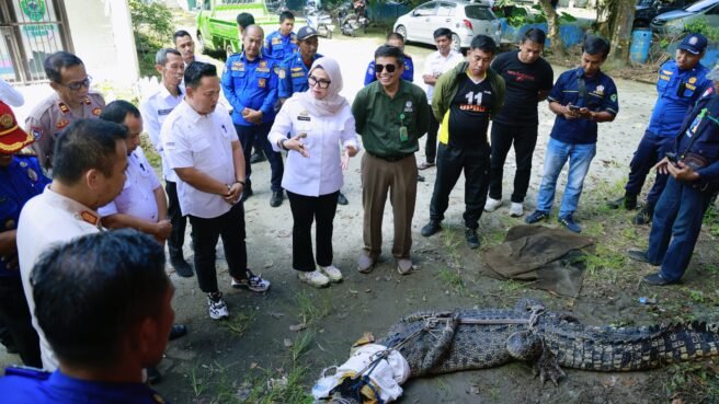 BARRU,HBK – Bupati Barru Andi Ina Kartika Sari menyerahkan buaya yang ditangkap oleh tim Damkar Barru ke pihak balai Konservasi Sumber Daya Alam (KSDA) Sulsel setelah sebelumnya, buaya tersebut meresahkan warga setempat. Penyerahan buaya berukuran 4 meter tersebut di Rescue Centre Damkar Barru, Rabu 23/4/2025.