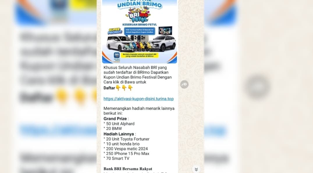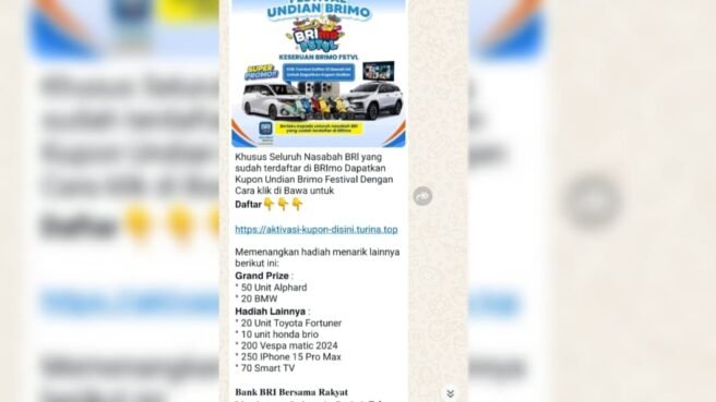 Baru-baru ini beredar pesan berantai yang menawarkan hadiah fantastis, mulai dari mobil Alphard, BMW, hingga iPhone 15 Pro Max, dengan syarat melakukan pendaftaran melalui tautan mencurigakan.