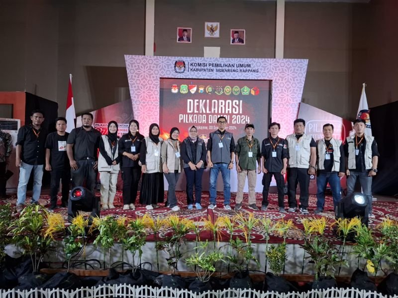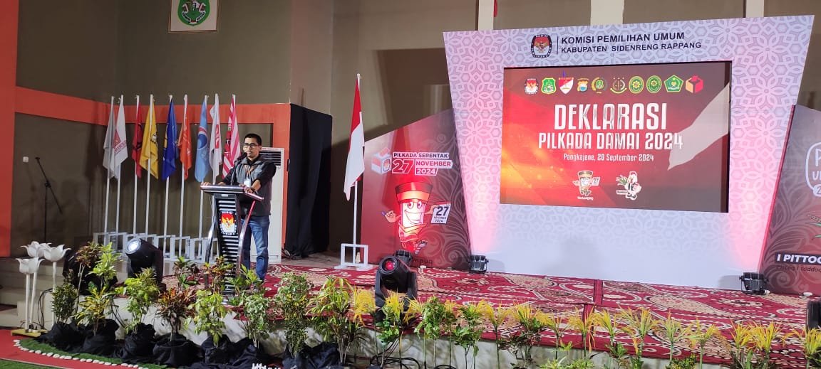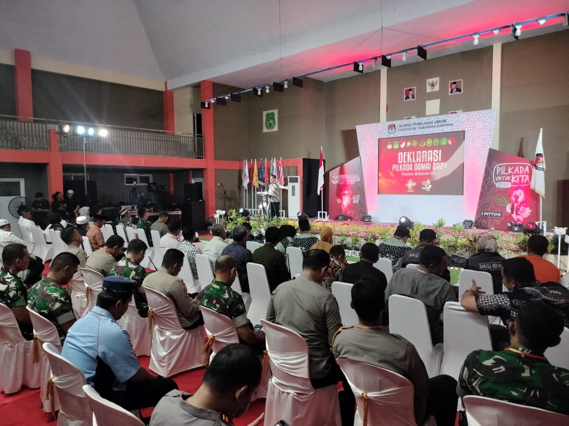 SIDRAP, HBK — Komisi Pemilihan Umum (KPU) Kabupaten Sidrap menggelar deklarasi Pilkada Damai 2024 di Gedung Masyarakat Pangkajene, Kecamatan Maritenggae, Jumat malam, 20 September 2024.